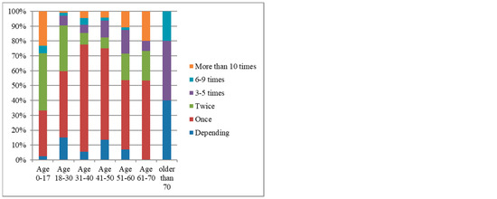 The characteristics of the frequency of returning home among the different age groups follow. People aged 31–50 years had the lowest return rate, most preferring to come home only once a year. The frequency of people aged 51–70 years varied, with half returning home once a year and the rest evenly distributed between two or more visits. The group aged 18–30 years exhibited the return characteristics of low frequency and high randomness, while the visits of people older than 70 years were both highly frequent and random. People under the age of 18 years exhibited a two-headed trend, with a high proportion going home either 1–2 times or more than 10 times. Generally speaking, the frequency of returning home tended to have an inverted U shape with increasing age.