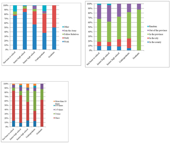The migration destination choice was found to be closely related to education level (Figure 4). As the education level increased, the proportion of “in the county” and “out of the province” destinations decreased, while the proportion of “in the province” increased. The main migration destinations of the people with senior high school education or less were “in the province” and “out of the province,” while they were “in the city” and “in the province” for the people with an undergraduate degree. Most of the people with a graduate degree preferred “in the province” as their migration destination, accounting for 87.5%. The migration destination choice of people with senior high school education or less was slightly random; the proportions of “random” were 2.33% and 2.86% for people who had not been to school or had a senior high school education or less.