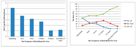 The influence of transportation mode on the frequency of returning home was obvious. When the mode was either “by air” or “by car,” the randomness of returning home was higher. When the mode of transportation was “by air,” most people preferred to go home once or twice a year. When the number of trips home was less than five, the modes of transportation were more diverse, otherwise driving predominated.