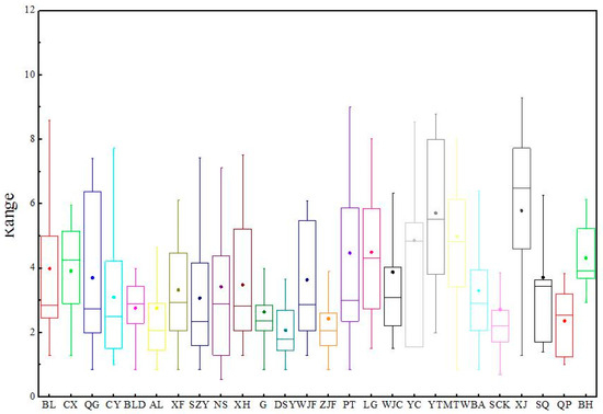 The median is a better measure of the data since it is not affected by the extremes. The box plot in Figure 5 reveals that the variation of village hollowing was significant. There is one village with a median <2, and its box plot is short, that is, its household hollowing value is concentrated.