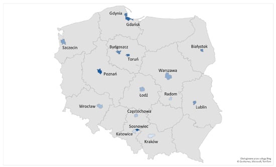 We analyse the Polish cities with more than 200,000 inhabitants. According to the population as of 31 December 2019, there were sixteen such cities in Poland. Figure 2 shows the distribution of these cities in Poland.
