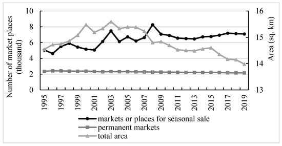Before ranking large cities in Poland with respect to their attractiveness for marketplace trade, we present some background information for the whole of Poland (Figure 3, Figure 4, Figure 5 and Figure 6). Data from Statistics Poland (Local Data Bank, LDB) indicate that in 1995–2019, the number of marketplaces in the whole of Poland remained stable, while since 2003 their area has decreased. However, the total number of marketplaces or places on streets and squares for seasonal sales has increased as compared to 1995 (Figure 3).