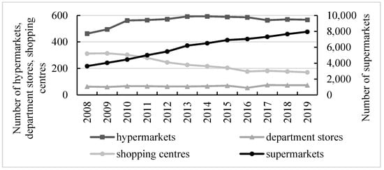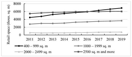 The reason for the decrease in the area of marketplaces may be the newly created shopping malls and hotels displacing marketplaces from attractively located areas. Figure 4 shows the number of large-format shops in Poland between 2008 and 2019. During this period, the number of newly established supermarkets increased sharply (from 3629 in 2008 to 7945 in 2019). During the same period, the number of department stores remained more or less the same, the number of shopping centres decreased (from 312 in 2008 to 171 in 2019), and the number of hypermarkets increased (from 463 in 2008 to 567 in 2019). Between 2011 and 2019, the largest increase was in the area of large-format shops (400–999 m2), i.e., smaller supermarkets (Figure 5).