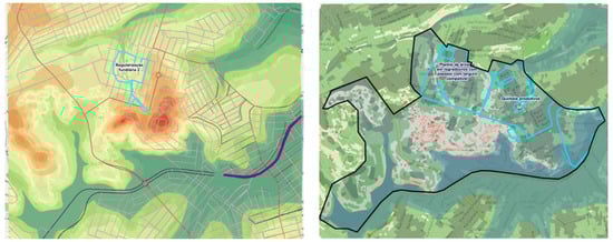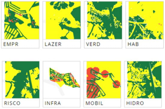 To illustrate the collection of data and the creation of these syntheses, we can use the “Housing variable”, used in in Paulo VI case study. In this case, the themes that were chosen included: presence of water bodies, which identified the areas dominated by water streaks or sources, high-voltage cables, slope inclination and buildings according to their height (using drone-generated data) and land deployment. These maps were used to separate the areas considered as an impeditive of occupation, ones where densification should be avoided, and ones which are still able to support further densification and verticalization in case residents had to be removed from high-risk areas. The evaluation models were marked in green, yellow, and red to indicate areas which were optimal for a given proposal (green), acceptable (yellow) and either inappropriate or where resources were already present (red) and were not apt to receive proposals (Figure 1).