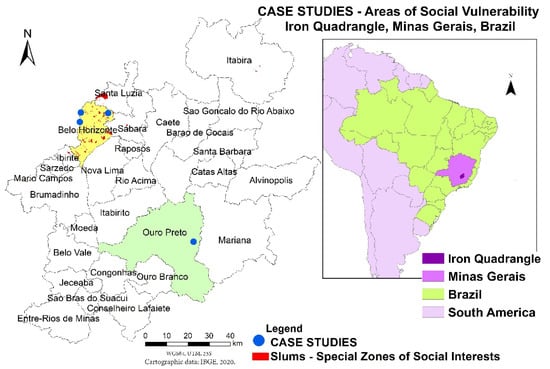 The Iron Quadrangle region is in central Minas Gerais, southwest Brazil, with an area of 11,676 km2 encompassing 28 cities. Since colonial times, the region holds major economic value. It has been a crucial source of mineral extraction (gold and iron ore), holds significant cultural value, expressive of movements ranging from the baroque to the modernist (also the birthing place of Brazil’s urban network) and possesses remarkable environmental resources. It is also characterized by serious conflicts of interest, which include urban expansion and its consequences, like the emergence of informal agglomerations and increased social fragility [9] Despite the concentration of this type of habitation in the capital (Belo Horizonte), they are also present in medium-sized cities, with slums occurring in five other cities, and every other city in the area is faced with irregular housing occupations.