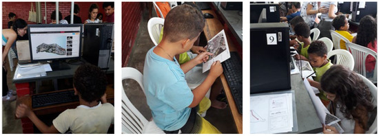 One highlight of the workshop was the central role of the drone-generated data and its use in the creation of a 3D model. This resulted in an updated registry of the current buildings, as well as publications regarding the processes used to create registry databases in areas of social vulnerability [26]. An experiment was made regarding the 24 participants’ ability to navigate through the representations of the area using the 3D model. They were divided into three groups: group A only had access to printed maps; group B had access to printed maps and the 3D model; group C only had access to the 3D model. The printed maps presented the same information as the 3D model, namely: altimetry, slope inclination, land usage and soil coverage, the neighborhood’s pathway structure. The children were asked to identify key elements, such as their school, to interpret the terrain and estimate the possible path that could be taken alongside water pathways and establish relationships between these different sets of information to gain knowledge on the risks faced by certain areas.