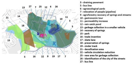 During the workshop, participants were separated into six groups and asked to propose and argue in favor of projects or policies in the following areas: Economic Development; Housing and Occupation; Leisure Equipment; Sports and Culture; Landscape and Environment; Mobility; Sanitation and Infrastructure. They started by developing their ideas for policies and projects in the form of diagrams. Next, they built their first and second designs, according to the logic that the initial design is never the best, so they had to verbally argue in favor of their proposal and, right after, create a second proposal based on the feedback they received. The six groups were further divided into three using a sociogram, which serves to find similarities between the thinking of each group. According to Steinitz [21], it improves teamwork in this stage. They voted on which groups they would like, not like, or are indifferent to joining, and divided accordingly. The resulting combinations were: Economic and Environmental issues; Habitation and Mobility issues; Infrastructure and Leisure. These groups then proceeded to create three more designs, which are then compared and negotiated to reach a final design.