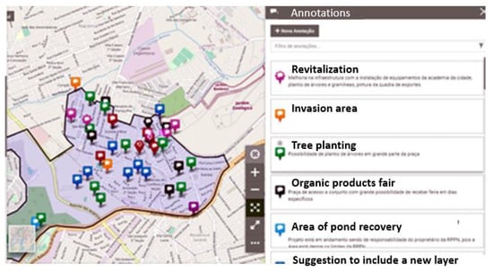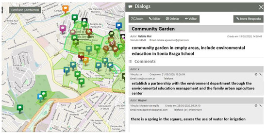 A tool named “Dialog”, in GISColab platform, was used in the Confisco study case for the design of ideas and the discussion among participants. When adding a proposal, it is important that they have a comprehensive title and the description of their ideas. It’s up to the coordination team to decide whether the participants should identify themselves. In some cases, the participant identification can be useful for metrics for analyzing relationships between social groups and proposals, or it can be useful for minutes of public meetings. Considering the participation of illiterate people, it would be necessary for them to verbalize to a mediator, who would do the writings, or they could record and attach an audio. It is also important to use a standard color system, according to each theme, with the same colors as before. However, in dialogs a new symbol structure must be used (which includes bubbles, stars, and others) and polygons or lines are also available.