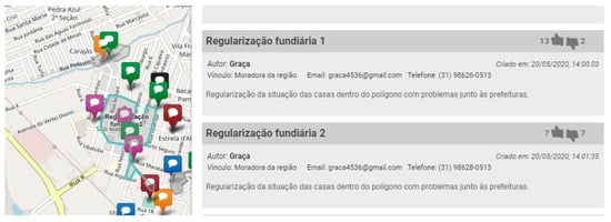 The “ciranda” stage results in an abundance of comments and is followed by the voting stage. It is worth noting that many of these stages can and should be developed as group efforts, with collective discussions, although the participants have the right to, at any given moment, sketch their own idea or post their individual opinions. It is important to note that votes are always individual. Discussions may be collective, but voting is individual. We chose this approach based on criticisms made in previous workshops, where some participants would overtake and direct the decisions due to their stronger rhetoric or acted in a way described by Khakee [1] as Advocacy Planning. In other words, one agent sees him or herself as responsible for representing social groups, under the impression they are not capable of representing themselves. For all these reasons, participants can individually use the “Like” and “Dislike” resources (Figure 15).