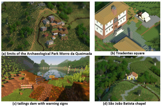 The chosen digital base was the Minecraft game, but on a platform optimized for geodesign activities, for co-creating ideas, called GeoMinasCraft The first step was to present the characteristics of the area according to the principle of geosystems [43,44,45]. That is, understanding its landscape as the result from the extraction of mineral resources during the gold cycle up to the iron ore cycle, in a process that produced a cultural landscape that is a representative of the Minas Gerais’ baroque period (i.e.: Barroco Mineiro). It also considered ecological issues related to biodiversity and geodiversity, geological heritage and geoconservation.The preparation and modeling stage involved GIS tools, such as terrain modeling and interoperability software, and geovisualization. Since the process to convert data into information was rather complex, in the sense of the number of tasks and data that had to be processed, Extract, Transform and Load (ETL) scripts were used to optimize the construction of the model [46]. The following resources for geovisualization were used: WorldPainter, to access Minecraft’s map production environment; MCEdit to access Minecraft-generated worlds and allow the insertion or removal of objects; and Chunky, which visually renders the worlds generated in Minecraft. Layers that were representative of the topography, water drainage network, soil usage, vegetation and existing tracks and pathways were created as part of this study. Areas of notable reference within the landscape were represented using the elements provided by Minecraft’s object repository. The chosen areas were the São Cristóvão neighborhood, Tiradentes Square and Morro da Queimada Archaeological Park, all of which worked as visual anchors of the areas with buildings (Figure 16).