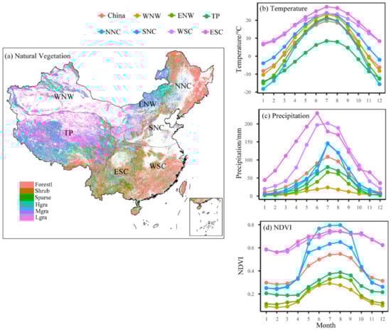 The distributions of natural vegetation (a), monthly temperature (b), precipitation (c), and Normalized Difference Vegetation Index (NDVI) (d) across China. Abbreviations: TP—Qinghai-Tibet alpine region; WNW—Western arid and semi-arid region; ENW—Eastern arid and semi-arid region; SNC—Southern North China; WSC—Western South China; ESC—Eastern South China; NNC—Northern North China; NDVI—Normalized Difference Vegetation Index.