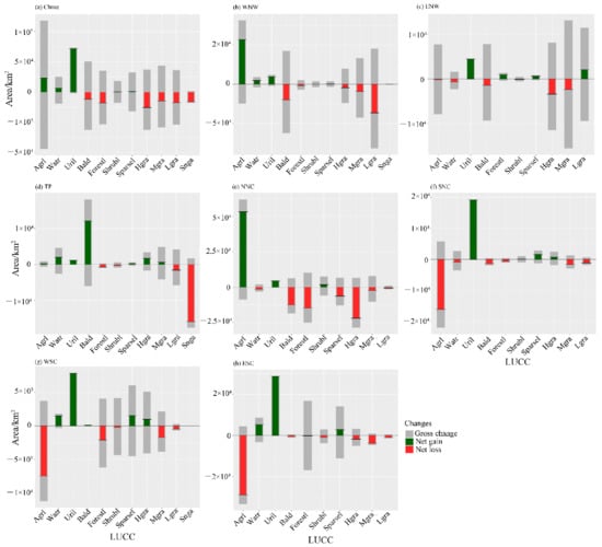 Gross change, net gain, and net loss of different land use/land cover (LUCC) in China from 1980 to 2015. (a) Throughout China; (b) WNW—Western arid and semi-arid region; (c) ENW—Eastern arid and semi-arid region; (d) TP—Qinghai-Tibet alpine region; (e) NNC—Northern North China; (f) SNC—Southern North China; (g) WSC—Western South China; (h) ESC—Eastern South China.