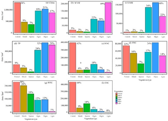 Areas and proportions of different types of natural forest and grassland in China from 1980 to 2015. (a) China; (b) WNW—Western arid and semi-arid region; (c) ENW—Eastern arid and semi-arid region: (d) TP—Qinghai-Tibet alpine region; (e) NNC—Northern North China; (f) SNC—Southern North China; (g) WSC—Western South China; (h) ESC—Eastern South China.