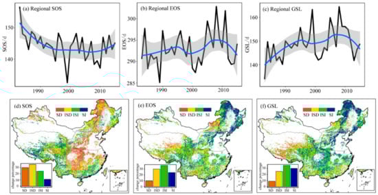 - SOS and EOS of natural vegetation in China showed trends of advancing and delay, respectively, during 1982–2015, resulting in GSL being prolonged by approximately eight days. SOS was advanced and EOS was delayed in WNW and ENW, leading to a 21 d and 10 d prolongation of GLS, respectively. Particularly in WNW, there were significant changes in the regional trends of the EOS and SOS. SOS was particularly important to GLS in ENW, with its contribution rate exceeding 80% in almost all vegetation types. Since NNC was dominated by forests and high-coverage grasslands, SOS and EOS were significantly advanced and delayed, respectively. The SOS had a greater impact on GLS than the EOS, with a contribution rate exceeding 71%. SOS was significantly advanced in SNC at both the regional and grid scales, whereas EOS and GLS also showed significant increasing trends. SOS showed a significant advancing trend in WSC and ESC, whereas EOS did not change significantly. TP showed a unique phenological change that was opposite to that in other regions. Although the phenological change in TP was not significant, SOS was delayed and EOS was advanced, resulting in a shortened GSL.