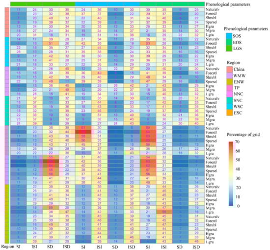 Percentage of grids with trends for phenological parameters (SD—significant decrease trend; ISD—insignificant decrease trend; ISI—insignificant increase trend; SI—significant increase trend. Abbreviations: Agrl—Agricultural land; Watr—Water bodies; Uril—Urban and rural land; Bald—Unutilized land; Forestl—Forest land; Shrubl—Shrubland; Sparsel—Sparse forest land; Hgra—High coverage grassland; Mgra—Medium coverage grassland; Lgra—Low coverage grassland; Snga—Permanent snow and glacier; WNW—Western arid and semi-arid region; ENW—Eastern arid and semi-arid region; TP—Qinghai-Tibet alpine region; NNC—Northern North China; SNC—Southern North China; WSC—Western South China; ESC—Eastern South China).