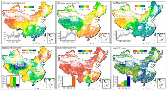 The mean and trends of precipitation (a,d), temperature (b,e), and the Normalized Difference Vegetation Index (NDVI; (c,f)) during the growing season in China (SD—Significant decrease trend; ISD—Insignificant decrease trend; ISI—Insignificant increase trend; SI—Significant increase trend)).