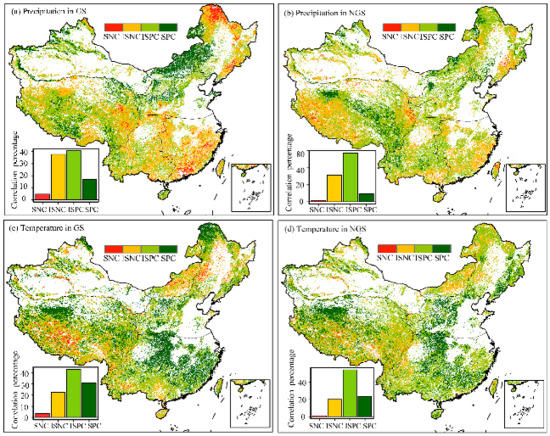 The correlation coefficients between the Normalized Difference Vegetation Index (NDVI) and climate variables in China. (a,c): Correlation between the growing season (GS) and the NDVI; (b,d): correlation between the GS NDVI and the previous non-growing season (NGS); SNC—Significant negative correlation; ISNC—Insignificant negative correlation; ISPC—Insignificant positive correlation; SPC—Significant positive correlation.