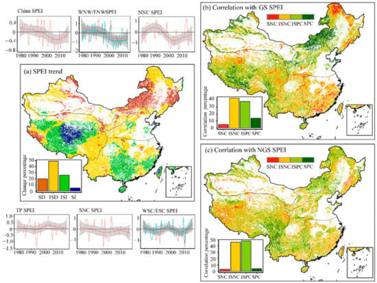 The changes to the Standardized Precipitation Evapotranspiration Index (SPEI) (a) and correlations between the SPEI and the Normalized Difference Vegetation Index (NDVI) in China (b): during the growing season (GS); (c): between the NDVI of the current GS and the SPEI of the previous non growing season (NGS).