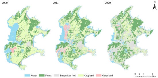 According to Table 1, cropland was the dominant land type, with an area of 150.53 km2, accounting for 46.34% of the island in 2000. Water and forest accounted for 20.80% and 22.25%, respectively, and the sum of the three accounted for nearly 90% of the study area. In 2013, the area of forest and cropland were 97.20 km2 and 105.20 km2, respectively, and the impervious land was about the same as the water. In 2020, the impervious land continued to increase, and the area reached 114.34 km2.