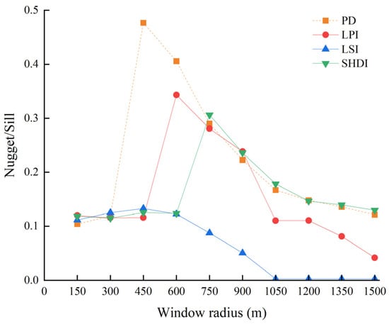The spatial variability characteristics of the landscape indices were explored at multiple continuous scales (Figure 3), which determined the characteristic scales. The results showed that nugget/sill of the landscape fragmentation index decreased with the increase in the window radius, which indicated that the degree of spatial variability decreases with the increase in the scale, and the spatial autocorrelation became more obvious and stable. Nugget/sill decreased significantly and changed unstably at 450, 600, and 750 m, while it started to stabilize at about 1050 m. Therefore, 1050 m was considered to be the best scale to reflect the spatial variability characteristics of landscape fragmentation in the study area.
