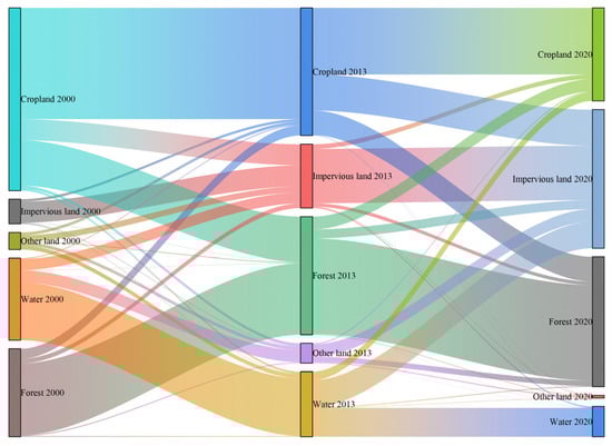 The landscape transfer matrix can clarify the loss and shift between landscape types in each period of the study area, and obtain information on the transformation between different landscape types in the early and late periods of the study period, which has rich statistical significance [26,42,43]. This study mainly depicted landscape transfer in 2000–2013 and 2013–2020 using Sankey energy balance diagrams.