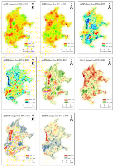 The spatio-temporal variation of landscape fragmentation with the window size of 1050 m was shown in Figure 5: From 2000 to 2013, the high values of positive LPI change rate were mainly concentrated in the central area of the county, the northern mountainous coastal area, and forest of the central and western mountainous region. The high values of negative LPI variability were mainly concentrated in the west of artificial reclamation area and in the south agricultural land. From 2013 to 2020, the high value of positive LPI change rate was mainly concentrated in the southwestern port and the emerging center of the experimental area, and the overall performance was sporadic, respectively. The high value of negative LPI change rate was mainly seen in the southern coastal zone and some areas in the north farmland. The trend of LSI was similar to PD. The spatial distribution of PD and SHDI rates of change were roughly opposite to that of LPI. The high positive in LPI was often the high negative area of PD and SHDI. In contrast, the high negative rate of LPI was often the high positive rate in PD and SHDI. Human interference was more intense, and fragmentation began to increase in the central-northern and southern urban farmland areas, while in the northern forested zone, ecological restoration was good and fragmentation continued to decrease.
