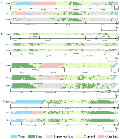 S2 and S3 were perpendicular to S1 through two urban centers. S2 in 2000 was dominated by cropland. With the acceleration of urbanization, the area of cropland on the lower elevations decreased rapidly from 2013 to 2020, converting into forest and construction land. The city continued to expand. The construction of the Tannan Bay scenic area in the south of S2 promoted the reforestation of the area. S3 in 2000 was also dominated by cropland, followed by saltworks and forest. From 2000 to 2020, the saltworks were gradually replaced by construction land. The cropland at the bottom of Mountain in the north was also gradually replaced by emerging new urban areas. The forest in the south of S3 was gradually shifted to a higher terrain. Construction of the southern part of the traffic circle, which started in February 2010, led to increased fragmentation of the cropland and showed a discrete distribution characteristic. The southern sandy shoreline was also replaced by an artificially landscaped shoreline.