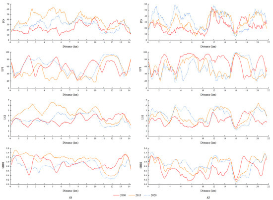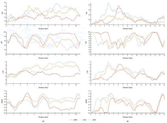 S2 was the longest, with varied topography and diverse landscape types. The overall trend of PD values from 2000 to 2020 did not change much, and the peaks were mainly at 11.3–14.5 km from the starting point (in north), where they had low elevation, a relatively gentle terrain, scattered settlements and rich land cover. The PD values in 2013 and 2020 increased with elevation at 16.1–21 km from the starting point. The SHDI, LSI and PD values of S2 were stable within 15 km from the starting point, where it had diverse landscape types and fragmented patches. At a distance of 15–18 km, the urban landscape was dominant, and the forest and cropland transformed into construction land. This was near the center of the county, with a single landscape type. Additionally, LPI values reached their maximum, and PD, SHDI and LSI values were at their lowest. From 2000 to 2020, patch density of landscape types and landscape heterogeneity increased, the landscape shape increased, and landscape fragmentation showed an overall upward trend.