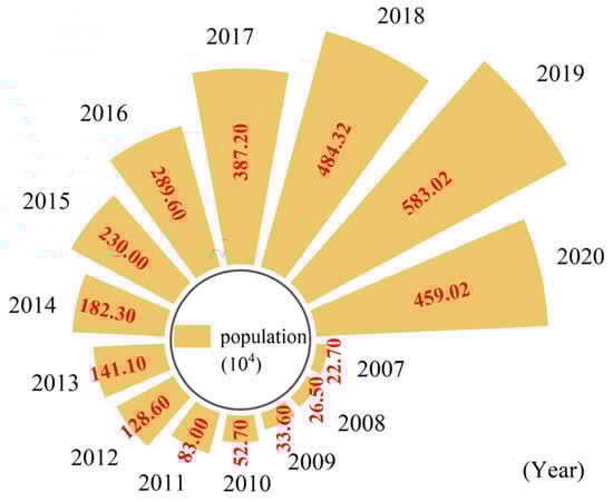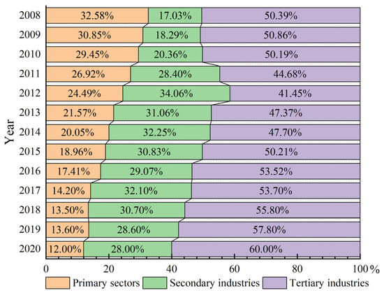 The tourist population to Haitan island has increased year by year since 2007, from 0.23 million to 5.83 million in 2019. In 2020, affected by COVID-19, the tourist population decreased by 1.24 million compared to 2019 (Figure 12). Most resort infrastructure and tourist accommodation were within 200 m of the coastline. Although a large number of tourists brought lucrative economic income to the local area, it brought great pressure on the ecology of the island. Forests, water sources, vegetation and species suffered damage and landscape fragmentation gradually intensified. Similar to most tourism-oriented islands, Haitan Island has begun to strengthen ecological construction and environmental protection of coastal area and wetland, while protecting tourism resources [61,62]. Since 2015, the experimental area has been strengthening the ecological construction and environmental protection of the near-shore sea area (Table 2). At the same time, driven by island tourism, Haitan Island has begun integrating and utilizing rural resources, gradually breaking away from the traditional fishery production method, transforming and developing the tourism service industry, and drawing on the management model of advanced leisure agriculture to create a tourism and sightseeing industry. This has not only brought economic benefits to farmers and enterprises, but it has also helped to reduce the sanding of farmland caused by abandonment. Furthermore, the optimization and upgrading of the industrial structure has achieved obvious results, with the structure of the thrice Industrial adjusted from 33:17:50 in 2008 to 12:28:60 in 2020 (Figure 13).