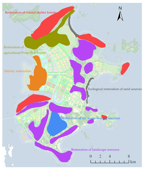 Due to the continuous urbanization of islands throughout the world, it is urgent to take measures for reversing the negative effects of the associated fragmentation. (1) Urban center area. As the balance between jobs and housing provision is easily lost over time [64], this requires rational control of property development, such as increasing the urbanization rate and centralizing housing to alleviate the crowding of the cropland and sea [65,66]. (2) Radiation area of urban center (such as the south-central part of Haitan island) and the construction of green areas and waters should be increased. Although that will cause a certain degree of landscape fragmentation, it can play a positive role in landscape ecology [17]. (3) Cropland protection area. Optimizing the layout of water conservancy facilities and improving the planting structure should be carried out. These measures will increase the continuity of the landscape in cropland. (4) For areas of high touristic value, the government should take measures to curb the trend of landscape fragmentation when adjusting and optimizing tourism patterns [62]. All these will promote the sustainable development of the ecological environment of the island. The specific ecological restoration measures and spatial optimization are shown in Table 3 and Figure 14.