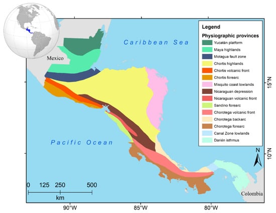 - Marshall, J. The geomorphology and physiographic provinces of Central America. In Central America: Geology, Resources and hazards; Bundschuc, J., Alvarado, G.E., Eds.; T&F: Tokyo, Japan, 2007; p. 1436. [Google Scholar]