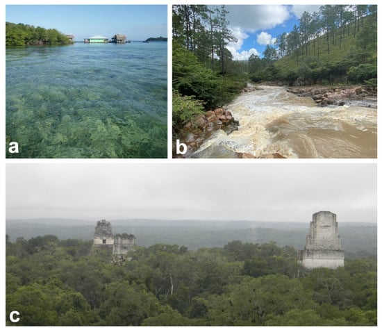 (a) Bocas del Toro archipelago in Panama, (b) Fluvial landscapes of Honduras in El Paraiso Department, (c) Karstic flatlands in Tikal at northern Guatemala. Photos: Adolfo Quesada-Román (a,c) and Jainer Antonio Argeñal Umanzor (b).
