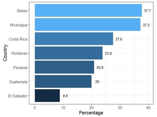 Central America is made up of seven countries: Guatemala, Belize, Honduras, El Salvador, Nicaragua, Costa Rica, and Panama. It has a continental area of 2,452,270 km2. Central America land uses normally comprise forests, croplands, and pastures, but the main urban centers have presented a rapid urban growth in the last five decades []. The region has almost 183 million inhabitants, a population density of 73 inhabitants per square kilometer, and 77.2% urban population.