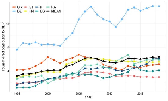 In Central America, different national policies were enacted to promote and organize the tourism sector in the last five decades. Some countries such as Costa Rica and Guatemala initiated a process that is widespread in the region nowadays (Table 2). The economic influence of tourism has a direct impact on the GDP percentage of the national economies of the region (Figure 9). The mean direct contribution of tourism in the region has been growing from roughly 3% in 1995 to 6% in 2018. Tourism represented almost 15% of Belize’s GDP in 2018, while it represented almost 3% for Guatemala. All countries showed a marked deacceleration after the economic crisis of 2008. Moreover, tourism promotes effective economic chains that involve transportation, accommodation, food, and entertainment in every possible scale, generating economic growth. The sustained economic growth tourism in the region is closely related to an environmental consciousness and compromise translated into natural, climatic change, and protected areas policies over the last few decades (Table 2).