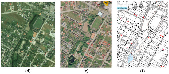 Location of water smithy and ponds: (a) map from XIX century, source: digital archives [21]; (b) map from 1938, source [22]; (c) historic airplane photo from the IIWW, source [23]; (d) historic orthophoto map from 1997, source [23]; (e) 2005, digital archives of the city of Rumia, source [23]; (f) today, orthophoto map, source: [12].