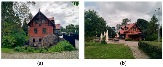In the place of the historic forge, in 2002, a water mill was built—today, the seat of the Kashubian-Pomeranian Association (Stowarzyszenie Kaszubsko-Pomorskie) and a restaurant with a name in the Kashubian language “Svantopołk” (Figure 7). Protection of Kashubian cultural heritage is vital. Next to the mill, the grinding wheel was reconstructed. The park became the place for education about the local history and heritage.