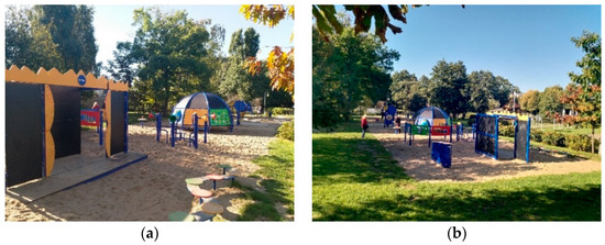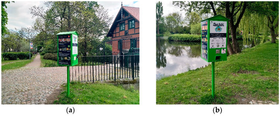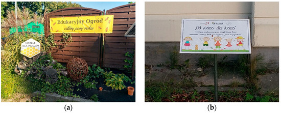 Two educational gardens were installed in the park, a popular place among schoolchildren. One, themed on biodiversity protection, is placed next to fencing and a small parking lot adjacent to the manor house—today MDK (a). It has an insect hotel with educational tables teaching children and adults about the importance of pollinators. The other, themed “from children to children”, is placed against the sports hall wall, next to recreational infrastructure and pedestrian path meandering along the banks of Zagórska Struga—local river and the fenced area of a local team soccer field. It offers a flower bed and educational tables (Figure 9).