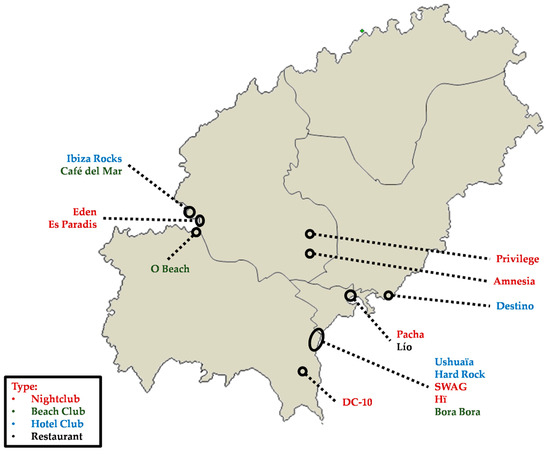 At present, Ibizan society is strongly dependent on tourist activity and is subject to the seasonal cycles of beach tourism. Ibiza tourism focuses on the offer of sun, sand, and sea, differentiating itself from other summer destinations with the offer of nightlife (Figure 2), luxury tourism, and other elements derived from the hippie presence, which are discussed below. The local society has some of the worst education and formal studies ratios in Spain, due to the ease of finding unskilled jobs in the tourism sector. There is a certain informal cultural preparation based on the interaction of a cosmopolitan society and a great fondness for travel for an important part of the residents. All of this creates an environment conducive to alternative cultures that is not prone to promoting more formal and technological research and development.