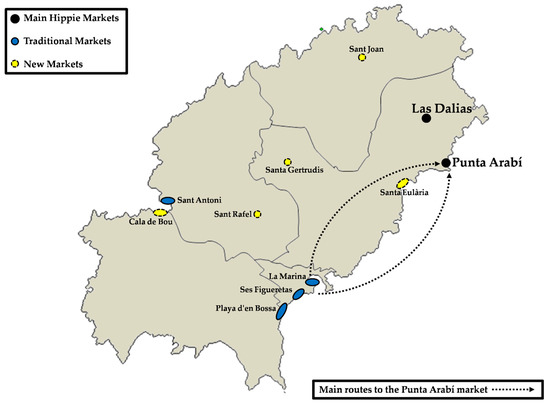 At the time of the hippie movement, there were already handicraft markets that appeared spontaneously in various places on the island, with the first in Patio de Armas of Dalt Vila (city of Ibiza) in 1966. Although they were not initially regulated, the legalization and establishment of agreements with the hippie artisans was sought from authorities and Fomento del Turismo, in order to take advantage of their presence for tourism promotion purposes [13]. Many of the handicraft markets of that time disappeared years ago, but, since then, various handicraft markets or hippie markets have appeared throughout the island (Figure 4).