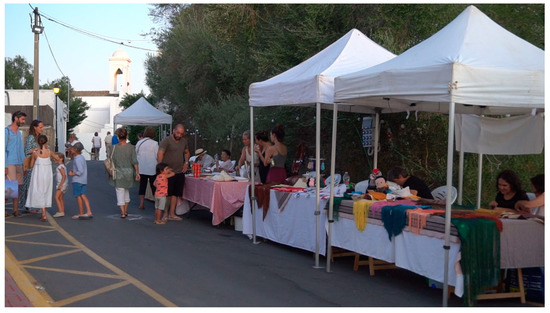 It is necessary to highlight the hippie markets of Punta Arabí (Es Canar) and Las Dalias (Sant Carles) for their size, age, and media impact. Both markets are private initiatives. Throughout the summer, there are several handicraft markets in the streets of main tourist areas: La Marina (port of Ibiza), Ses Figueretas (seafront of Figueretas), Sant Antoni (seafront of Sant Antoni), and Playa d’en Bossa. They are managed from town halls and occur every day in the afternoon. These markets seek to liven up the late-night tourist atmosphere in their respective areas. More recently, handicraft markets have been created for tourism purposes in other areas: Cala de Bou (Bay of Sant Antoni), Sant Rafel (Figure 5), Santa Gertrudis, Sant Joan, and Santa Eularia. These markets take place once or three days a week. In the case of Cala de Bou, they are promoted by neighborhood associations and managed by town halls. The latter have a very low number of visitors as they are starting up and are not yet consolidated.