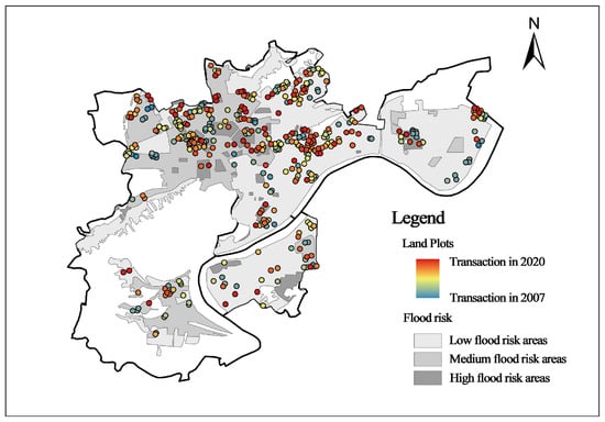 From the perspective of urban planning, spatial allocation should consider the risk of flooding. For the policy makers, it is necessary to include the flood risk in land transaction price determination and to compile a flood hazard risk map, particularly for residential land transactions. The information on flood risk should be released publicly and transparently to protect developers and residents’ right to know the land plots’ flooding status. According to the flood risk, the government should reasonably determine the development intensity of residential land and regulate the behavior of residential land transfer in high-risk areas. In view of the built-up residential land construction in high-risk areas, flood control projects that minimize the flood risk effect on residential land, such as green roofs and rain gardens, should be provided in urban renewal and transformation.