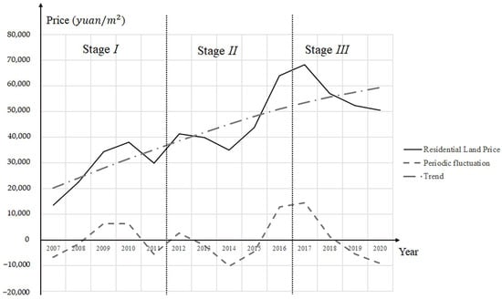 According to land market management policies, Hangzhou has used listings and biddings for residential land since 1992, and the residential land price shows a continuous upward trend during the study period (Figure 4). The HP filtering method is applied to the unit price of residential land to separate the trend and the random fluctuation element of the average unit price of residential land including land for commercial housing and affordable housing. Using the HP filtering method, the residential land market can be divided into approximately three periods, stage I (2007–2011), stage II (2012–2016), and stage III (2017–2020).