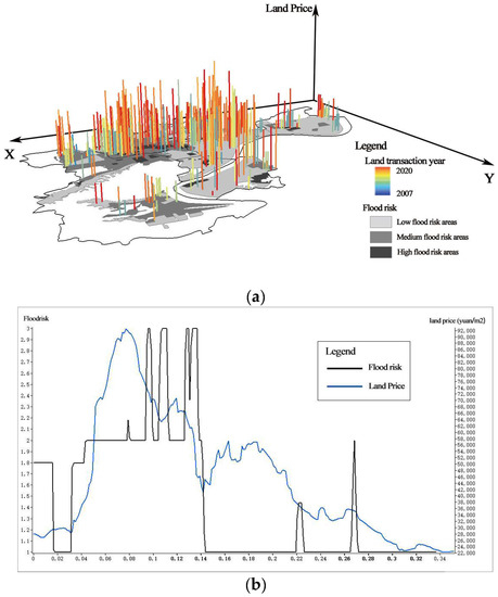 (a) Spatial 3D map of land price and flood risk, where the xy plane is the flood risk; (b) Sectional view of residential land price and flood risk, where the solid black line shows the flood risk curve from the west to east and the solid blue line shows the interpolated land price curve.