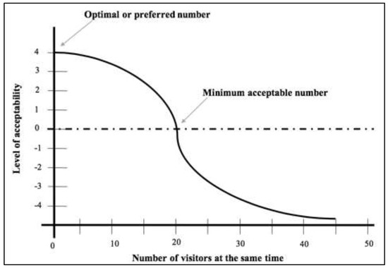 The perception of crowding is the negative evaluation of the density of people at a particular site, and its assessment allows us to define the maximum number of people that visitors expect to see at the same time in a specific location [23]. Identifying this maximum number or overcrowding standard is a fundamental step to improving site management. Overcrowding standards reflect the maximum number of people that a visitor agrees to see in a specific space at the same time before their level of satisfaction begins to decline. The variability of overcrowding standards will depend, to a large extent, on the personal and social norms of each visitor or social group. The use of social norms based on normative theory has proven to be an effective way to establish quality standards for visitor experiences such as overcrowding [25].