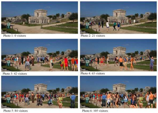 Two approaches have been used to determine congestion levels at tourism and recreation sites: the traditional narrative-descriptive approach and the visual approach. The first simply consists of an open-ended survey that asks respondents about the number of visitors encounters they see [32]. The second is the use of a series of computer-manipulated photographs showing different levels of tourism impact (e.g., photos of the same site with different numbers of visitors) [33]. In the case of sites with large numbers of visitors, the visual approach is more appropriate, as photographs make it easier to identify the concept of visitor overcrowding [34]. Thus, this study used the visual approach due to the high levels of use in Tulum.