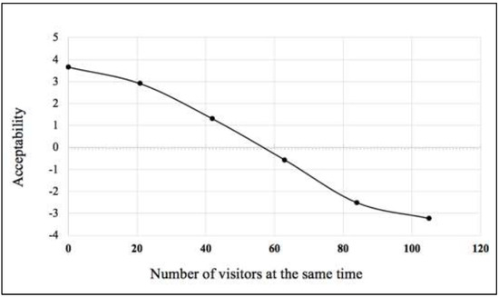 Overall, the average acceptance of crowding norms for all visitors to the Temple of the Frescoes ranged from 3.66 to −3.23 as the number of people in the photographs increased from 0 to 105.
