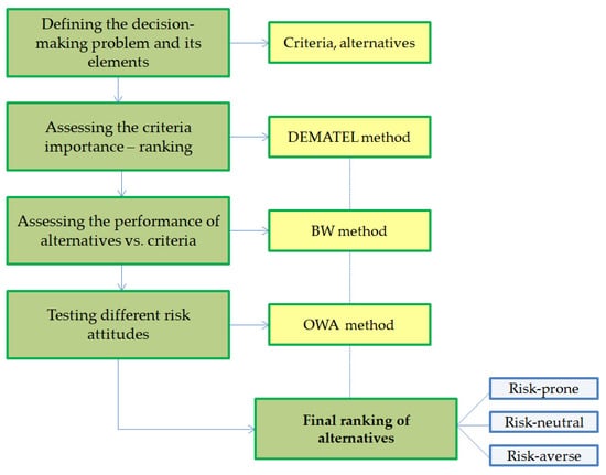 The last method used in the proposed framework is OWA—the method that takes into account the decision maker’s risk attitude. The method can be applied even without a real decision-maker; namely, the results can be tested for different scenarios (optimistic, fairly pessimistic, etc.). The input data are the ranking of the criteria (obtained in DEMATEL) and the performance of alternatives concerning each criterion (obtained in BW), and the OWA then inspects the final results for risk-prone, neutral, or risk-averse decision-making scenarios. The proposed scheme will be applied to a real case study example described in the next section.
