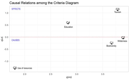 The values on the y-axis (ci − ri) determine which criteria are effects and which are the causes. In this example, based on the decision maker’s evaluation, C1, C2, and C5 are causes (the corresponding ci − ri values are negative), and the rest of the criteria—C3 and C4 are effects (the corresponding ci − ri values are positive). The values on the x-axis (ci + ri) determine the importance of the criteria, and in this example the order is the following: C2 > C3 > C1 > C4 > C5 (wilderness protection > promotion of tourism > biodiversity protection > promotion of education function > sustainable use of natural resources). This criteria ordering will be used in the rest of the evaluation process.
