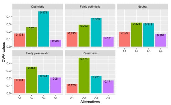 The results show that for all three risk attitudes, the bottom ranking is the same—alternative A1 is always in third place, and alternative A4 is always in last place. The results only differ for the first-ranked alternative—for the risk-prone attitude, A3 is the winner with a much better score in comparison to the second-ranked alternative (A2). For a risk-neutral attitude, the winner is the A3, but this needs an additional comment. Even though the alternative A3 outranks A2 formally interpreting, it should be noted that the OWA values for both alternatives do not significantly differ (0.321 to 0.312). For a risk-averse attitude, the winning alternative is A2, with a solid advantage over the alternative A3.