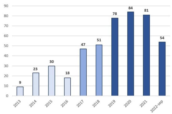 When analyzing the number of publications per year, a growing trend can be detected, which allows the identification of three periods in the evolution of academic literature on the subject studied: initial (2013–2016); development (2017–2018), and notable expansion or growth (2019–2022). A total of 62.53% of the publications were produced in the period of expansion, so the issue of smart cities in relation to urban land use is a very relevant issue, which is consistent with the major current concerns associated with the environment, the cost of energy, and concern for the well-being of citizens, both at government and business levels [40,41,42,43,44].